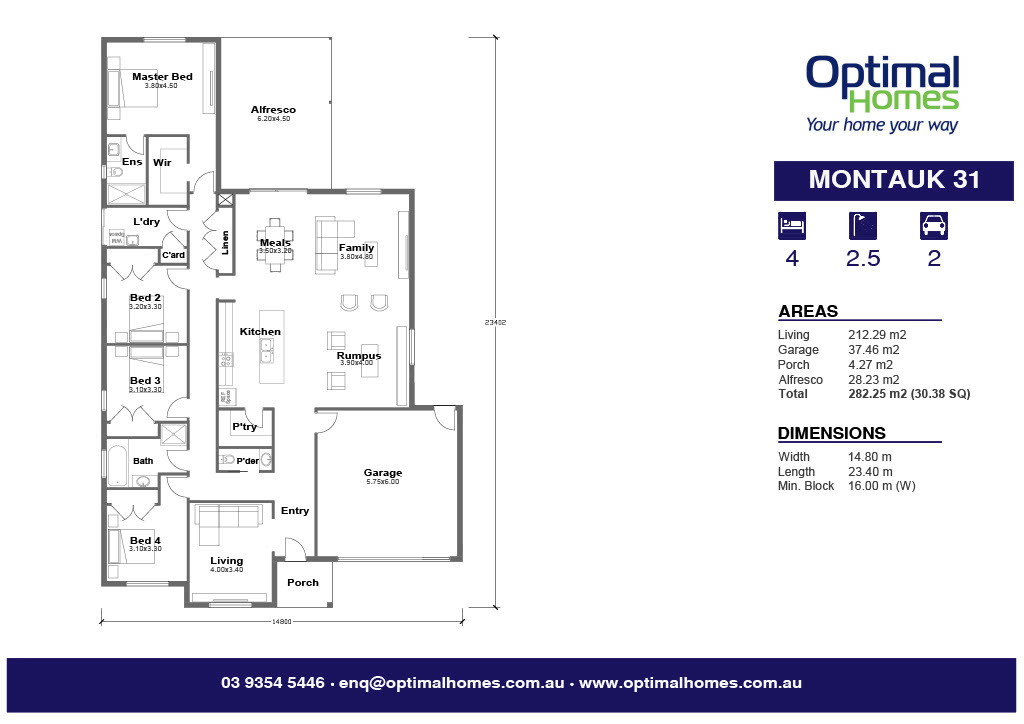 The Montauk 31 offers a large open concept living, dining and rumpus space off the kitchen near the entry of the home. Walk out to the alfresco off the meals area makes this home an entertainers delight! An additional living or optional study is situated at the entrance and near by is a powder room and bath. There are 3 large bedrooms tucked away privately down the corridor and at the end a spacious master with ensuite and walk in robe. The kitchen hosts a full walk in pantry and down the private hall is a full laundry with outside access.